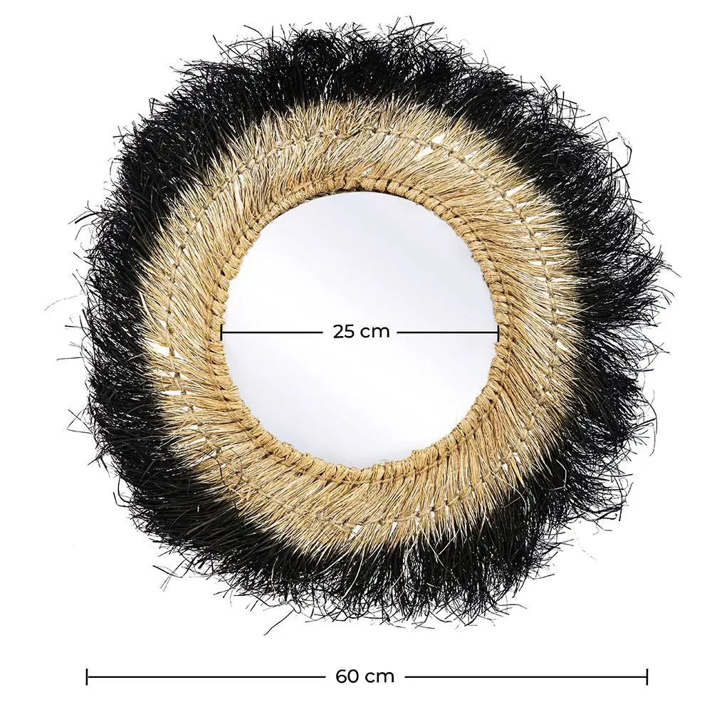 Unser Melu-Wandspiegel ist aus Seegras handgewebt und kombiniert auf elegante Weise Naturfarben mit Schwarz, wodurch er sich perfekt mit jedem Dekorationsstil kombinieren lässt. Hinter dem Sofa oder im Flur wird dieses Dekorationsstück eine charmante Note Ihrer Innenrichtung verleihen. Da dieses Produkt handgefertigt ist, kann das Design von Artikel zu Artikel leicht variieren.
