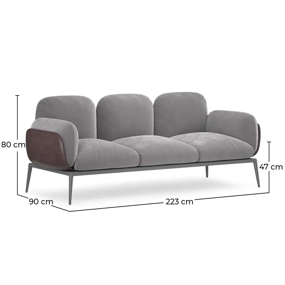 Entdecken Sie Eleganz und Komfort in ihrer höchsten Ausdrucksform mit unserem dreisitzigen Sofa, Greda, das mit Samt bezogen ist. Dieses Sofa vereint perfekt Stil und Komfort und wird zum Blickfang in jedem Raum. Mit seinem eleganten und modernen Design fügt sich dieses Designer-Sofa nahtlos in jede Einrichtung ein, insbesondere dank seines dunklen, veganen Lederaußenbezugs, der zu den Beinen passt. Durch seine kompakte Größe ist es sowohl für Hotels, Besprechungsräume und Wartebereiche als auch für Wohnzimmer oder Büros perfekt geeignet. Dieses mit weichem Samt bezogene Sofa ist sorgfältig verarbeitet, um eine unübertroffene Qualität zu bieten. Sowohl die Struktur als auch die Polsterung sorgen für einen bequemen, stabilen und langlebigen Sitzkomfort.