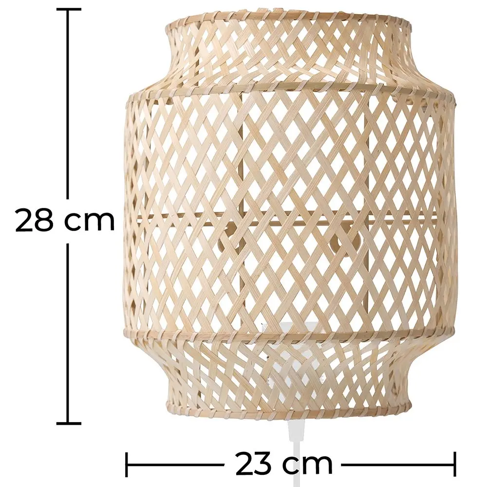Der perfekte Bambus-Wandlampenschirm für den Tisch. Dieser Lampenschirm erzeugt eine gemütliche und entspannende Atmosphäre, dank seines weichen Lichtes. Mit dem Schirm aus geflochtenem Bambus verleihen Sie Ihrem Schlaf-, Wohn- oder Esszimmer einen natürlichen Touch und bekommen eine trendige Wandtischlampe.