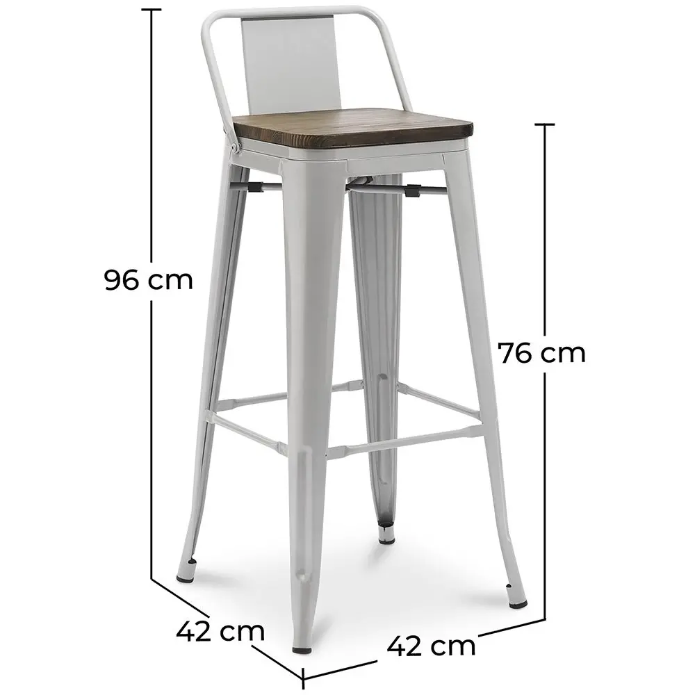 Genießen Sie Komfort und Stil in Ihrer Küche oder Bar mit dem Metalix 76 cm Hocker mit Rückenlehne und dunklem Holzsitz. Sein robustes industrielles Design kombiniert einen langlebigen Stahlrahmen mit einem dunklen Holzsitz, der Wärme und Eleganz verleiht, perfekt für moderne und anspruchsvolle Innenräume.
