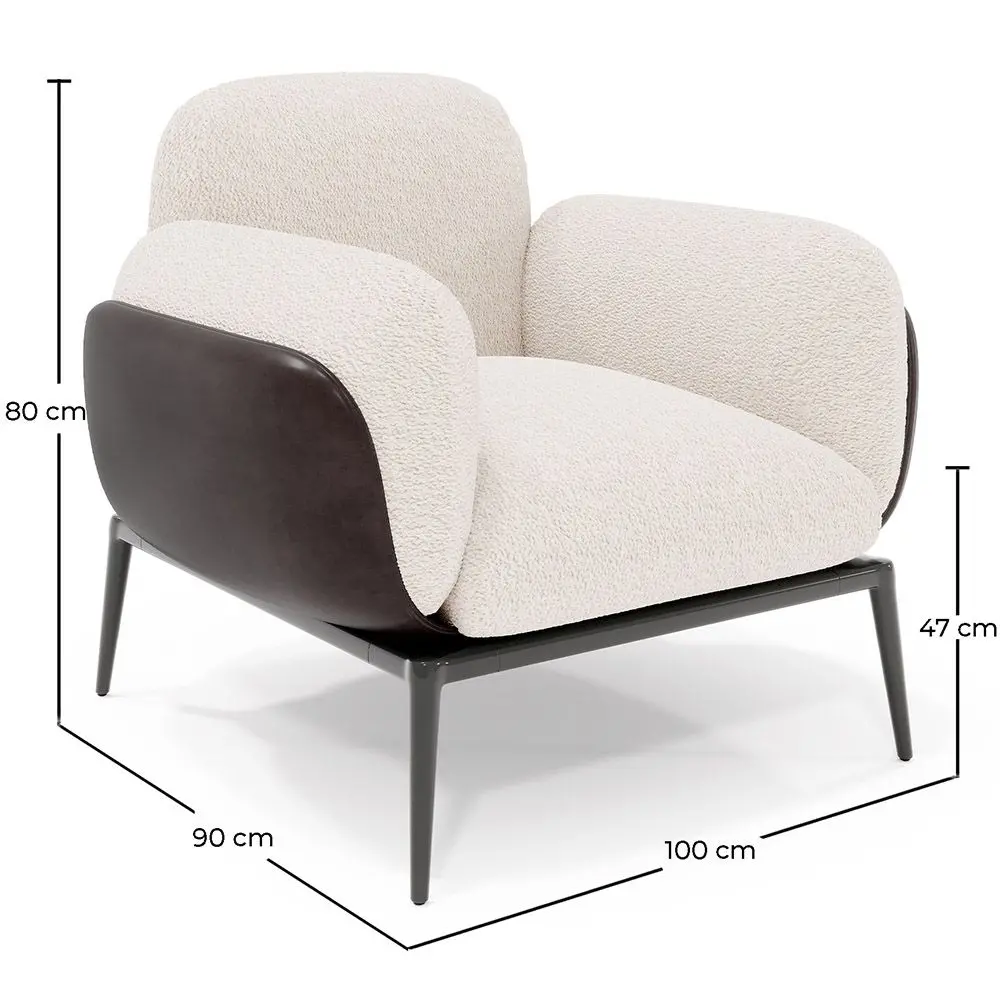 Unser mit Bouclé-Stoff bezogener Greda-Sessel ist ein elegantes und raffiniertes Stück, das jedem Raum in Ihrem Zuhause, Restaurant, Hotel oder Geschäftszentrum Wärme und Stil verleiht. Der Bouclé-Stoff zeichnet sich durch seine weiche, gemütliche und widerstandsfähige Textur aus, die dem Sessel ein gepolstertes und flauschiges Aussehen verleiht. Die Farbe des Bouclé-Stoffs ist ein sanfter cremeweißer Ton, der sich leicht mit jeder Dekoration und jedem Möbelstil kombinieren lässt. Darüber hinaus wird der Sessel von einer Metallstruktur in einem dunklen Ton getragen, die den Stoff perfekt ergänzt und jedem Raum eine moderne Note verleiht.