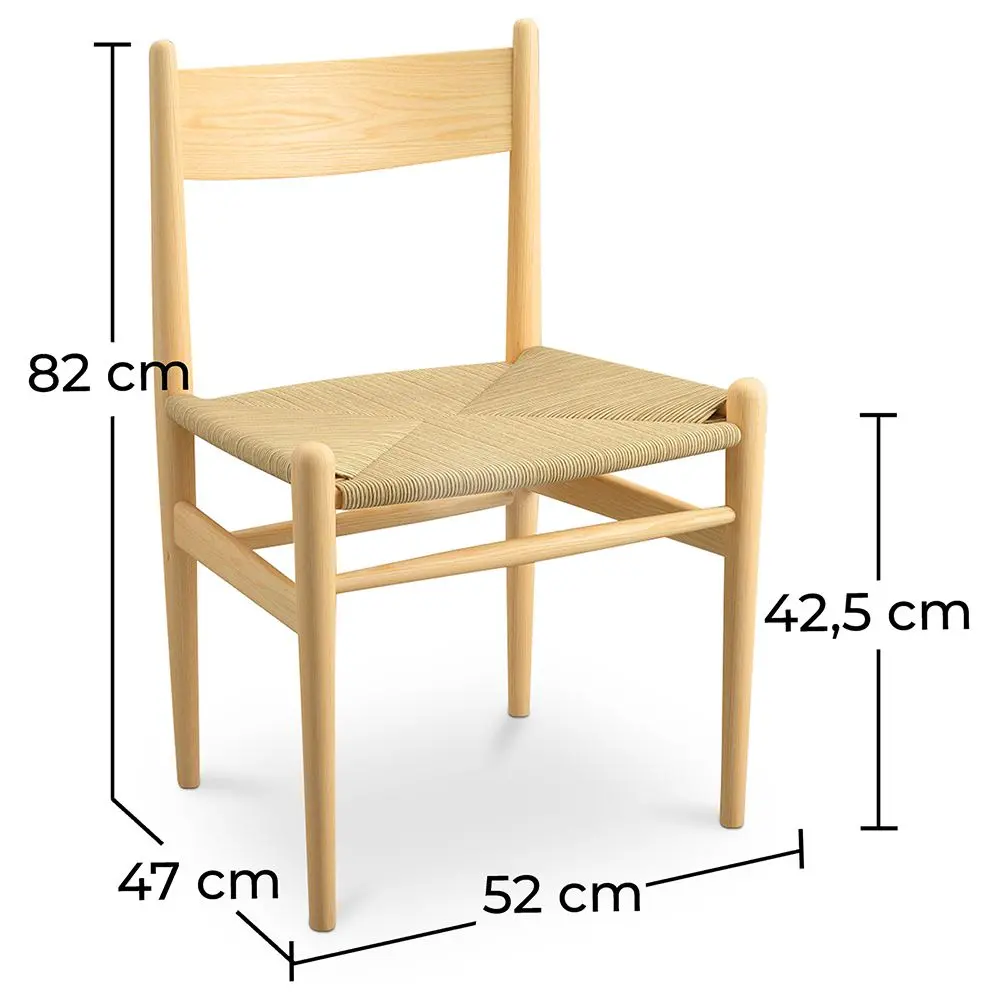 Es besteht aus einer Struktur aus massivem Eschenholz und einer mit natürlichem Seil geflochtenen Sitzfläche. Dieser Esszimmerstuhl ist eine Erinnerung an klassische Küchenstühle vor Jahrzehnten.