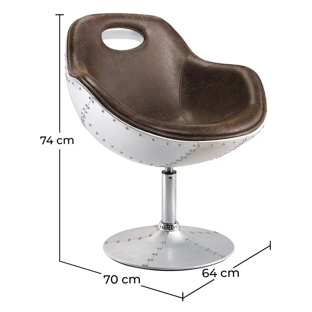 Verwandeln Sie Ihren Raum mit dem Drehsessel im Aviator-Stil, einer perfekten Fusion aus Stil und Komfort. Die Polsterung aus veganem Leder mit Vintage-Effekt bietet eine fesselnde Retro-Ästhetik, während das robuste Metallgestell in Nickeloptik Stabilität und Modernität gewährleistet. Ideal für Restaurants, Besprechungsräume und Hotels wird dieser Sessel zum Blickfang in jedem Raum und bietet Ihren Gästen ein unvergleichliches Erlebnis. Ziehen Sie organischen Verkehr an, indem Sie sein vielseitiges, hochwertiges und nachhaltiges Design hervorheben.