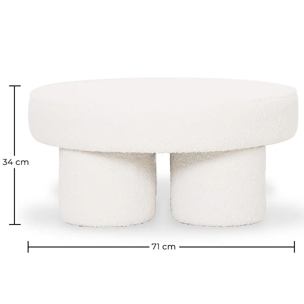 Verleihen Sie Ihrem Wohnzimmer Stil und Funktionalität mit diesem eleganten, multifunktionalen Ottoman, der mit weißem Bouclé-Stoff bezogen ist. Sein rundes Design mit zylindrischen Beinen macht ihn zu einem vielseitigen Möbelstück, das als moderner Couchtisch, niedriger Hocker oder dekorative Fußstütze verwendet werden kann. Perfekt für minimalistische, nordische oder zeitgenössische Wohnzimmer, kombiniert dieses exklusive Designerstück Komfort und Trend in einem einzigen Element.