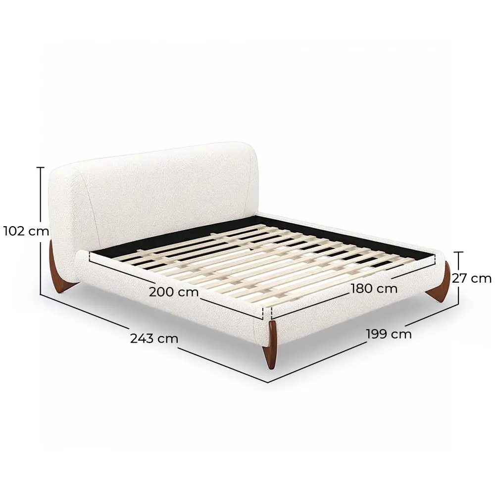 Dieses Bett, das für Matratzen mit den Maßen 180x200 cm entworfen wurde, vereint Eleganz und Funktionalität mit seinem Holzrahmen, der mit Bouclé-Stoff bezogen ist. Die dunkelbraunen Holzbeine verleihen einen Hauch von Raffinesse, während der Lattenrost, bestehend aus zwölf MDF-Holzlatten, eine robuste und langlebige Unterstützung gewährleistet. Sein modernes und minimalistisches Design macht es zu einem perfekten Stück, um dem Schlafzimmer einen trendigen Touch zu verleihen. Ideal für diejenigen, die ein Gleichgewicht zwischen Stil und Komfort suchen, verwandelt dieses Bett jeden Raum in eine gemütliche und zeitgenössische Oase.