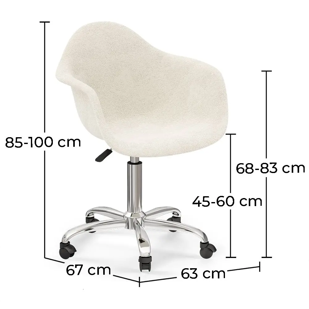 Suchen Sie einen bequemen und modernen Arbeitsstuhl? Der Emery Bürodrehstuhl ist perfekt für Sie. Dieser hochwertige Stuhl ist mit strapazierfähigem weißem Bouclé gepolstert und passt sich jeder Einrichtung an. Der robuste und bequeme Schreibtischstuhl bietet Ihnen hohen Komfort und passt sich all Ihren Bedürfnissen an. Er ist leicht zu montieren und wird mit Rädern geliefert, damit Sie ihn leicht in Ihrem Arbeitsbereich bewegen können.
