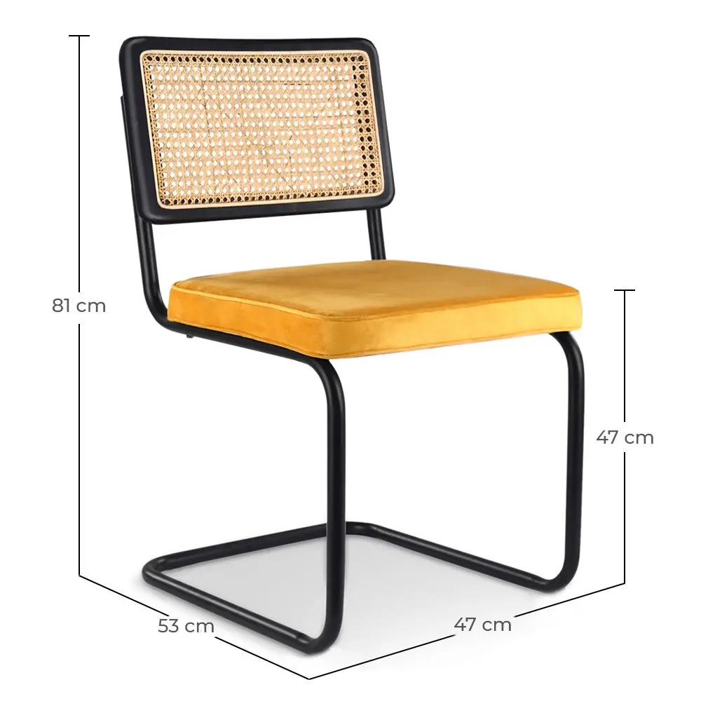 Lassen Sie sich von diesem Esszimmerstuhl aus geflochtenem Rattan umrahmt aus SchwarzHolz und ausgestattet mit einem angenehmen Samtkissen, zu einem einzigartigen Essbereich inspirieren. Sein edles Design verleiht der Dekoration Ihres persönlichen Essbereichs einen wohlfühlenden und auffallenden Retro-Look. Entscheiden Sie sich für Qualität, Komfort und Funktionalität!