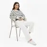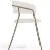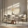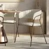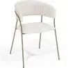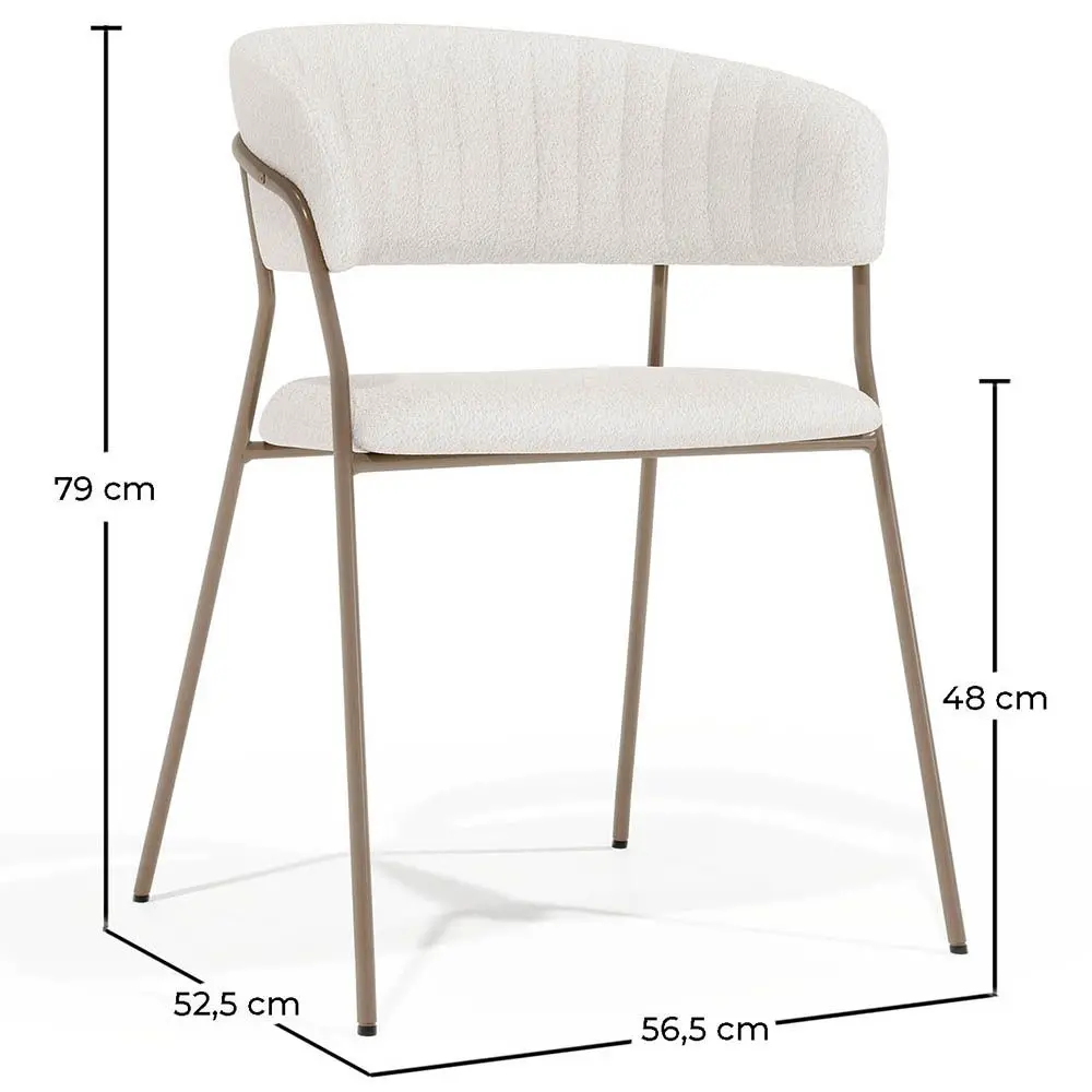 Der mit Bouclé-Stoff bezogene Esszimmerstuhl mit einer champagnerfarbenen Metallstruktur ist ein elegantes und vielseitiges Möbelstück, das Stil und Komfort perfekt vereint. Die Bouclé-Stoffpolsterung verleiht ihm eine weiche und gemütliche Textur und bietet denjenigen, die darauf sitzen, ein Gefühl von Luxus und Komfort. Dieser Stoff ist auch langlebig und widerstandsfähig gegen Verschleiß, was ihn zu einer idealen Wahl für stark frequentierte Räume wie Hotels, Restaurants und auch für das Zuhause macht. Das Metall, das für seine Struktur verwendet wird, ist robust und stabil und sorgt für eine solide und stabile Basis für den Stuhl. Darüber hinaus ist die champagnerfarbene Farbe elegant und vielseitig und passt sich nahtlos verschiedenen Dekorationsstilen an.