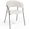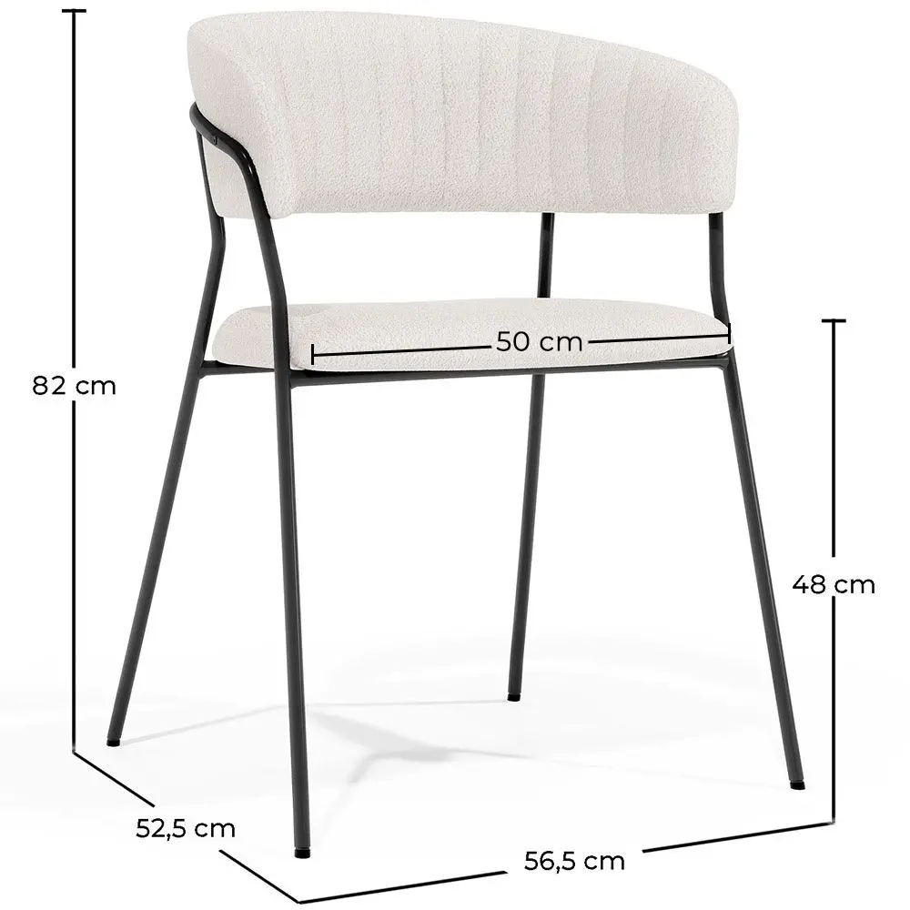 Der Esszimmerstuhl, bezogen mit Bouclé-Stoff und einem schwarzen Metallgestell, ist ein elegantes und vielseitiges Möbelstück, das Stil und Komfort perfekt miteinander verbindet. Der Bouclé-Stoffbezug verleiht ihm eine weiche und gemütliche Textur und bietet denjenigen, die darauf sitzen, ein Gefühl von Luxus und Komfort. Dieser Stoff ist zudem strapazierfähig und widerstandsfähig gegen Abnutzung, was ihn zu einer idealen Wahl für stark frequentierte Räume wie Hotels, Restaurants und auch für das Zuhause macht. Das in der Konstruktion verwendete Metall ist stabil und robust und sorgt für eine solide und stabile Basis für den Stuhl. Zudem ist die schwarze Farbe elegant und vielseitig, wodurch sie sich nahtlos in verschiedene Einrichtungsstile einfügen kann.