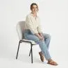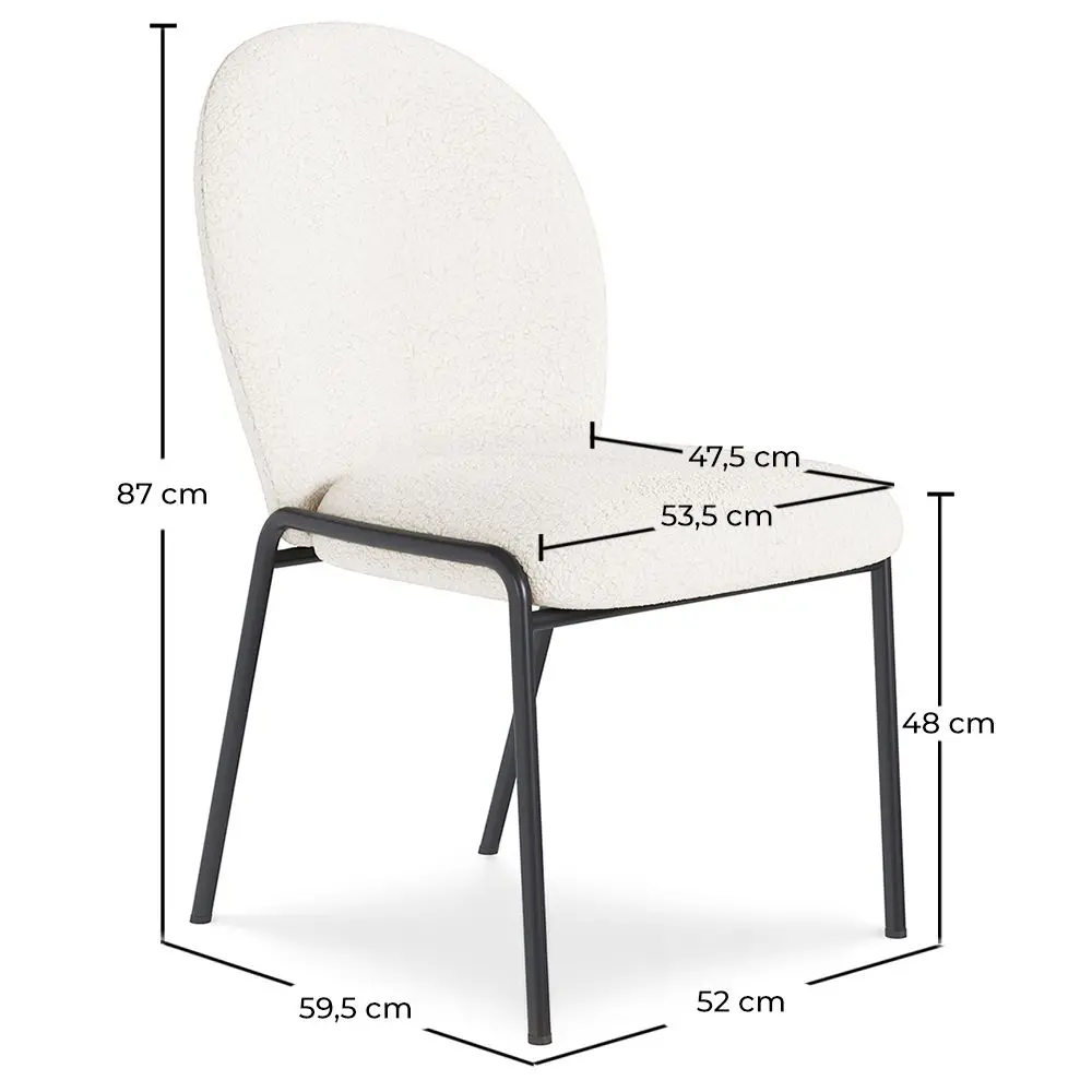 Ein Esszimmerstuhl mit einem organischen Design, der einen bequemen und eleganten Sitzplatz bietet. Der Toler Stuhl ist mit Bouclé-Stoff bezogen, einem großen Trend im Innenarchitektur-Design. Die schwarzen Metallbeine sind robust und von hoher Qualität. Dieser Stuhl mit organischen Design ist ideal für jeden Raum, Esszimmer, Büro, Schlafzimmer und auch für kommerzielle Räume, Restaurants, Luxushotels, Cafés, die Möglichkeiten sind vielfältig.
