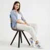 Da dieser skandinavische Küchenstuhl mehrfarbig ist, wird er leicht zu Ihrem einzigartigen Raumdekor passen. Außerdem können Sie diesen Esszimmerstuhl aus Stoff jederzeit für andere Designkonzepte verwenden, die Sie ausprobieren möchten. Dieses exzellente Möbelstück kommt mit transferlackierten Beinen aus Metall. Sie sind langlebig und sicher und garantieren Ihnen maximalen Komfort, während Sie Ihre leckeren Gerichte genießen.