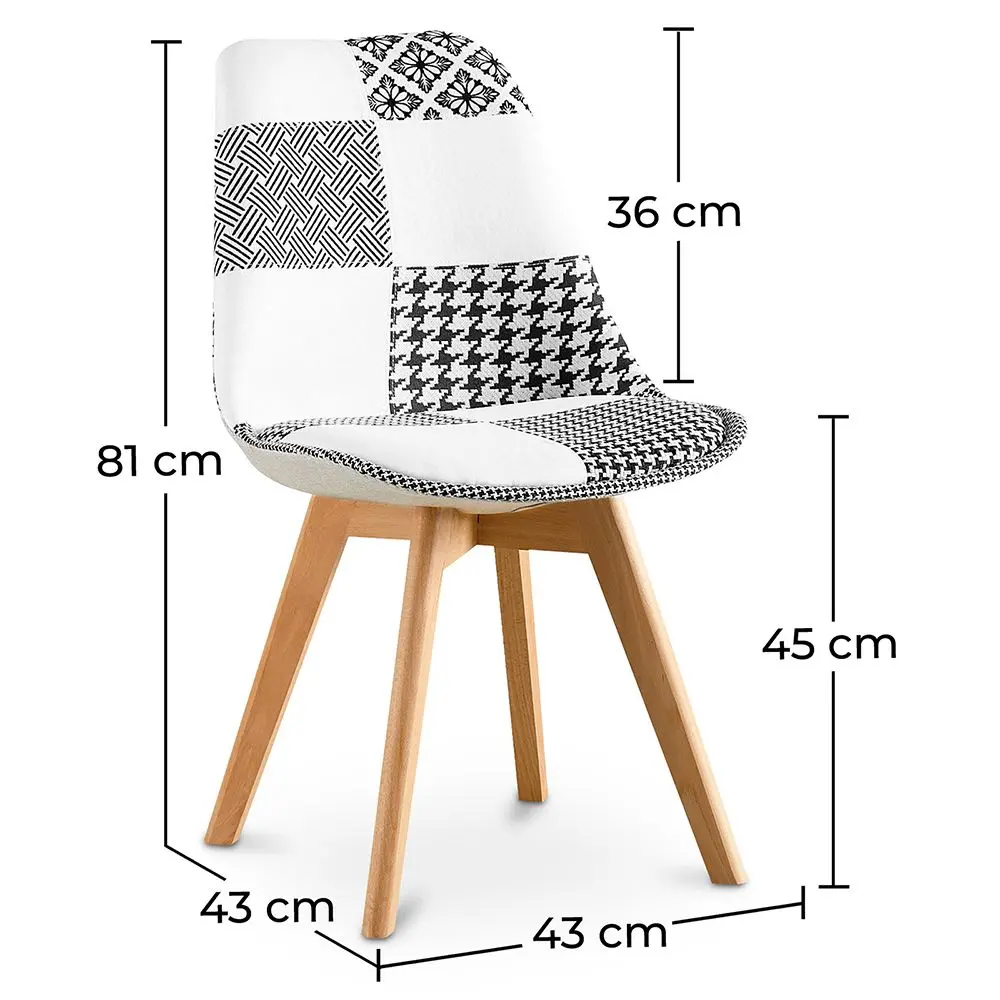 Komfort gehört in jedem Lebensaspekt zum Alltag, sei es im Büro, zu Hause, im Restaurant, im Hotel oder in anderen Erholungseinrichtungen. Diese Patchwork-Stühle stellen ein modernes Konzept von gepolsterten Esszimmermöbeln aus Stoff dar. Die gepolsterten Esszimmerstühle sind ebenso luxuriöse wie komfortable Elemente, die das Innendesign jedes Raumes verschönern sollen. Unsere Produkte haben ein vielseitiges Design und sind angenehm für das Auge. Die skandinavischen Küchenstühle werden nach Ihren Wünschen mit elegantem schwarz-weißem Muster hergestellt. Neben der Eleganz wird die Robustheit und Flexibilität durch die festen Metallbeine mit der hölzernen Transferlackierung garantiert.