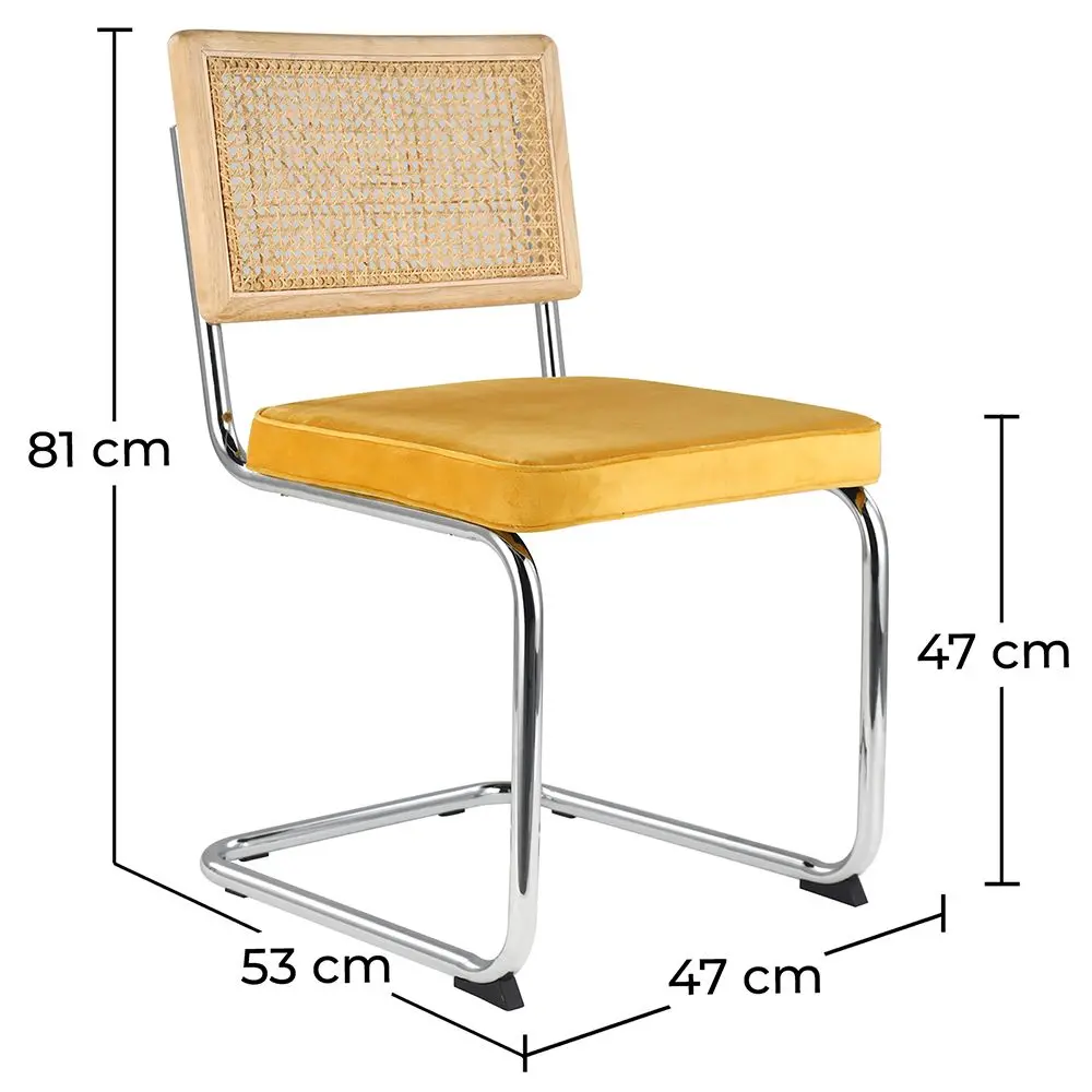 Lassen Sie sich von diesem Esszimmerstuhl aus geflochtenem Rattan umrahmt aus natürlichem Holz, verchromt aus hochwertigem Metall und ausgestattet mit einem angenehmen Samtkissen, zu einem einzigartigen Essbereich inspirieren. Sein edles Design verleiht der Dekoration Ihres persönlichen Essbereichs einen wohlfühlenden und auffallenden Retro-Look. Entscheiden Sie sich für Qualität, Komfort und Funktionalität!