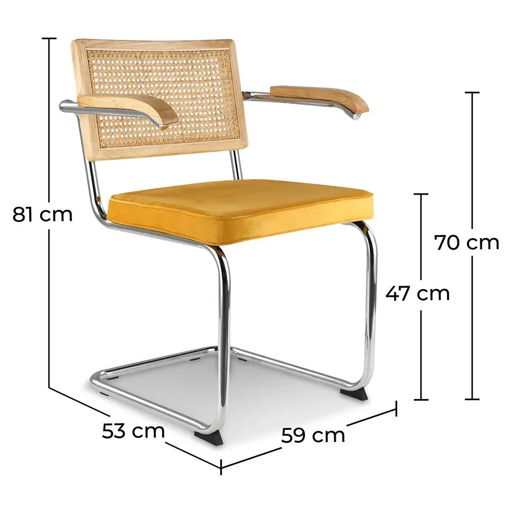 Ein freischwingender Esszimmerstuhl, dessen Retro-Charme Sie sofort verzaubern wird! Die bequeme Sitzfläche entzückt mit seinen weichen Samtstoffbezug. Die Rückenlehne aus geflochtenem Rattan, umrahmt aus hochwertigem Holz und einer praktischen Armlehne sowie verchromte Metallbeine kennzeichnen besonders gemütliche Küchen und schaffen durch ihre vielseitige Funktion in jedem Nutzungsbereich den nötigen Komfort. Gestalten Sie Ihr Essbereich nach Ihren Vorstellungen, überzeugen Sie sich selbst.