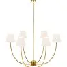 Entdecken Sie die perfekte Pendelleuchte, um Ihrem Zuhause oder Geschäft Glamour zu verleihen. Dieser Kronleuchter, aus strapazierfähigem Metall mit einer exquisiten antik-goldenen Oberfläche, verfügt über sechs elegante Stoffschirme in Cremefarbe, die warmes und gemütliches Licht bieten. Sein anspruchsvolles und zeitloses Design macht ihn ideal zur Verschönerung von Esstischen, Hotellobbys und gehobenen Restaurants. Erhöhen Sie Ihre Dekoration mit dieser Designerlampe, die Funktionalität und Ästhetik vereint und Räume voller Stil und Unterscheidung schafft.