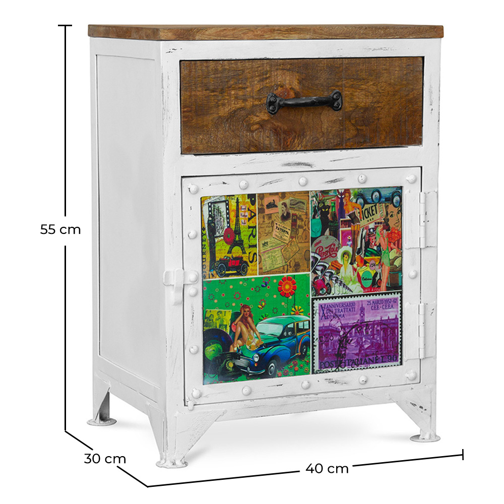 Dieser weiß gefärbte Nachttisch ist wirklich ein Schmuckstück aus Holz und Stahl. Er hat bunte Muster an den Seiten, die von Hand gemalt sein könnten. Er scheint wie ein Stück, dass Sie auf einem Flohmarkt gefunden haben und dass Sie mit viel Geschmack renoviert haben.