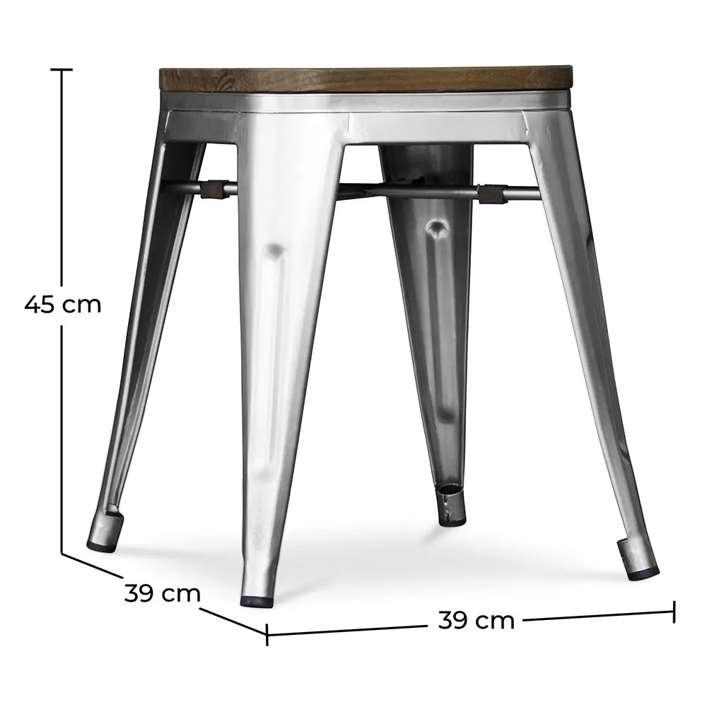 Erfrischen Sie Ihre Räume mit dem Metalix Hocker mit einer Höhe von 45 cm, der die Stärke von Stahl mit der Wärme eines natürlichen Holzsitzes kombiniert. Perfekt für niedrige Theken, Kücheninseln oder Ecken, die einen funktionalen Touch mit industriellem Charakter benötigen.