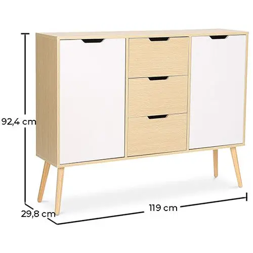 Dieses prächtige nordische Sideboard ist aus hochwertigem Holz gefertigt und besteht aus 3 großen Schubladen und zwei Türen an den Enden. Dieses Sideboard aus Holz besticht nicht nur durch seine große Speicherkapazität, sondern auch durch sein schönes Design, das Weiß mit natürlichem Holz kombiniert.