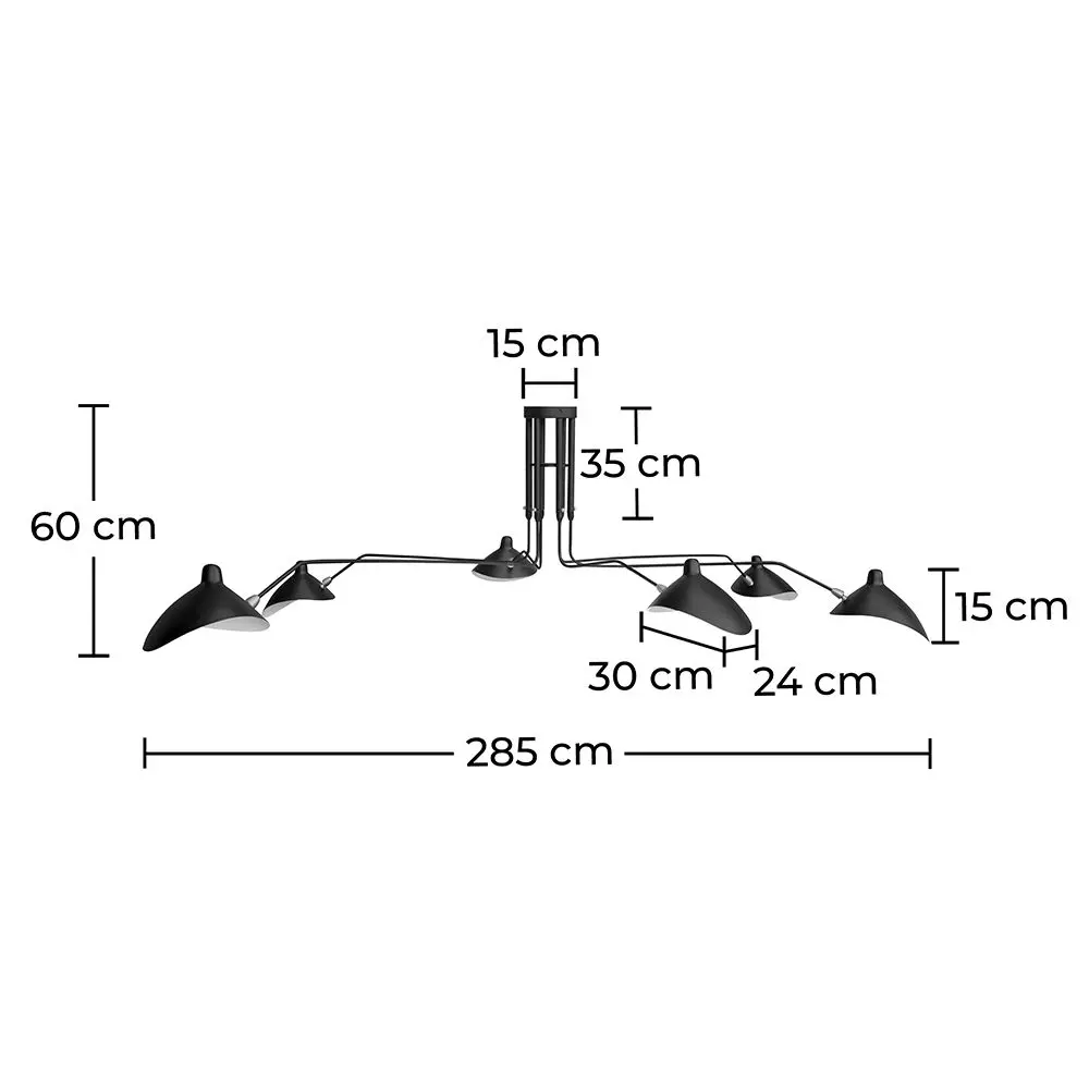 Die erstaunliche MNB-R6 Deckenleuchte hat sechs Arme, endend in 6 drehbaren Schirmen. Das von dieser Lampe emittierte Licht bietet eine warme und einladende Atmosphäre. Dank ihrer Größe ist es ideal für die Beleuchtung von großen Räumen und Freiflächen.