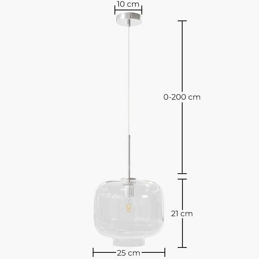 Verleihen Sie jedem Raum Stil und Helligkeit mit dieser eleganten Pendelleuchte aus Glas und Metall. Ihr minimalistisches Design mit transparentem Schirm hebt die Glühbirne hervor und schafft eine warme, einladende Atmosphäre – ideal für Wohnzimmer, Esszimmer, Küchen oder sogar gewerbliche Räume. Hergestellt aus hochwertigen Materialien, verbindet sie die Widerstandsfähigkeit von Metall mit der Leichtigkeit und Reinheit von Glas und garantiert Langlebigkeit und ein edles Finish.