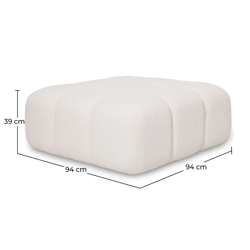 Dank seines modularen Designs können Sie ihn als zusätzliche Ablage, Fußstütze oder Erweiterung Ihres Sofas verwenden, perfekt integriert mit anderen Modulen der Kollektion. Die hochwertige Bouclé-Polsterung garantiert Widerstandsfähigkeit, Langlebigkeit und ein anspruchsvolles Finish, das Ihre Wohnraumgestaltung aufwertet.