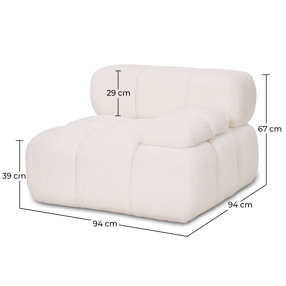 Geben Sie Ihrem Wohnzimmer ein zeitgemäßes und gemütliches Gefühl mit diesem modularen Ecksofa, das in weißem Bouclé-Stoff bezogen ist. Sein vielseitiges Design ermöglicht es Ihnen, es mit anderen Modulen zu kombinieren, um verschiedene Konfigurationen zu schaffen, die sich an große oder kleine Räume anpassen, je nach Ihren Bedürfnissen.