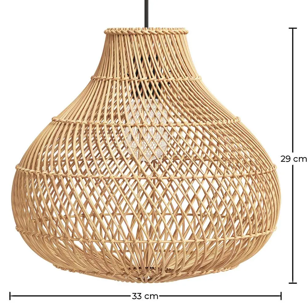 Diese wunderschöne Hängeleuchte vereint perfekt die rustikale Eleganz von Rattan mit dem charmanten Boho-Design. Rattan, ein natürlicher und nachhaltiger Werkstoff, wurde geschickt verwoben, um eine offene und leichte Struktur zu schaffen, die das Licht auf warme und gemütliche Weise durchlässt. Der natürliche Ton des Rattans unterstreicht den handwerklichen Look und betont die Schönheit der handgewebten Fasern. Die Form der Hängeleuchte ist organisch und frei, mit sanften und fließenden Kurven, die jedem Raum eine gewisse Bewegung und Dynamik verleihen und sie somit nicht nur für private Haushalte, sondern auch für Hotels, Restaurants und andere kommerzielle Räume ideal machen.