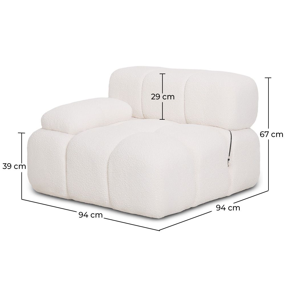Geben Sie Ihrem Wohnzimmer ein zeitgemäßes und gemütliches Gefühl mit diesem modularen Ecksofa, das in cremeweißem Bouclé-Stoff bezogen ist. Sein vielseitiges Design ermöglicht es Ihnen, es mit anderen Modulen zu kombinieren, um verschiedene Konfigurationen zu erstellen, die sich an große oder kleine Räume anpassen, je nach Ihren Bedürfnissen.