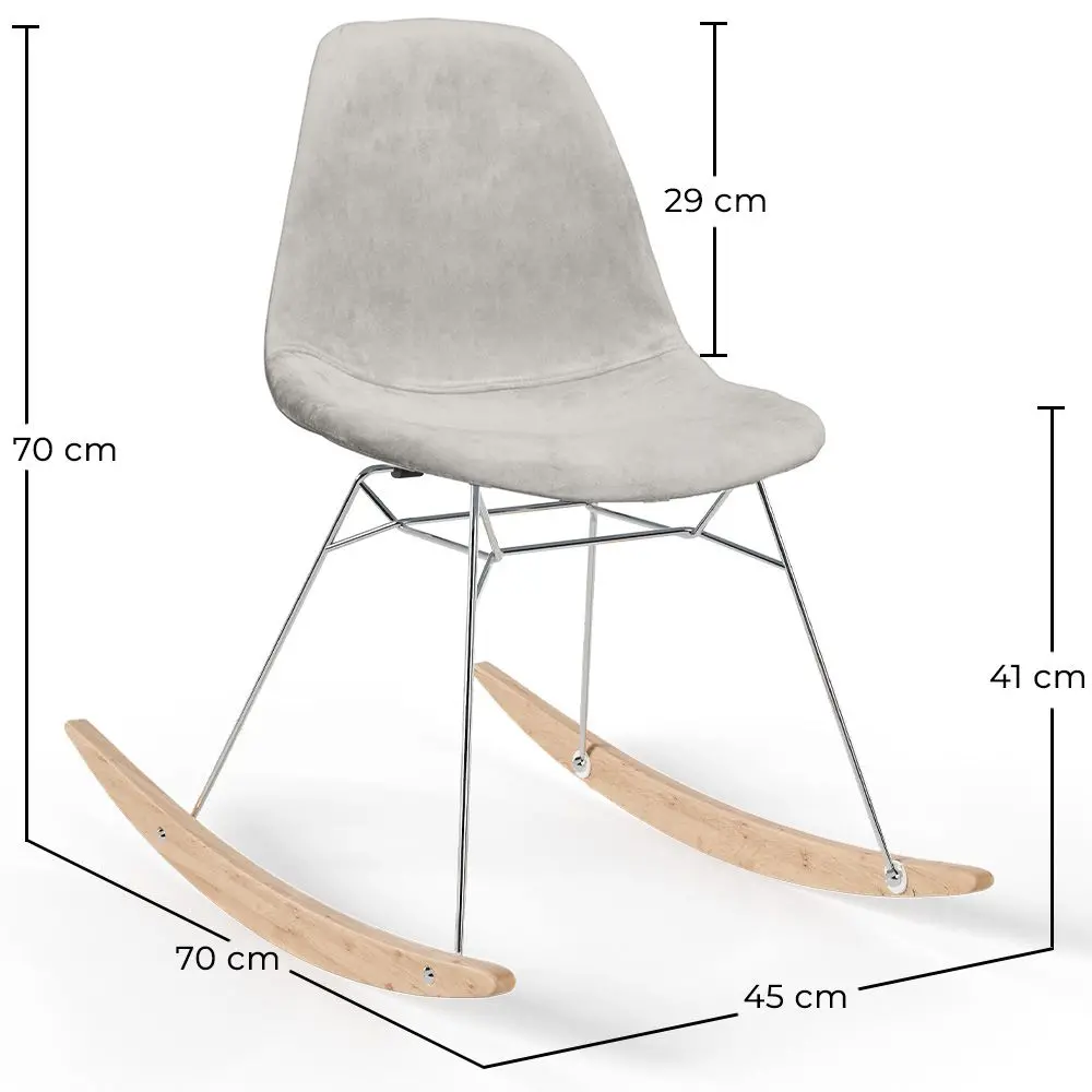 Genießen Sie einen entspannenden Moment mit diesem eleganten, modernen Schaukelstuhl für Erwachsene. Sein ergonomischer Sitz ist mit weichem, hochwertigem Samtstoff gepolstert, perfekt, um jedem Raum Stil und Komfort zu verleihen. Der Rahmen kombiniert verchromte Stahlbeine mit geschwungenen, massiven Holzgleitern, die eine stabile Basis und eine sanfte, komfortable Schaukelbewegung bieten. Perfekt für das Wohnzimmer, Schlafzimmer oder die Leseecke, ist dieser Schaukelstuhl die perfekte Mischung aus zeitgenössischem Design, Komfort und langlebigen Materialien.