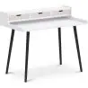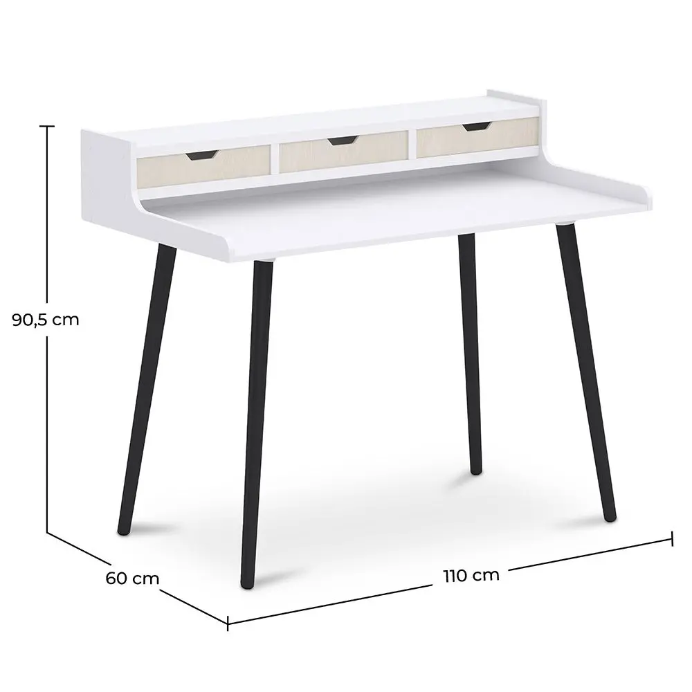 Dieser innovative Home-Office-Schreibtisch hat eine weiße Platte mit abgerundeten Kanten und bietet eine zuverlässige und lang anhaltende Beschichtung für jede Aktivität. Der hölzerne Schreibtisch ist ideal, um in einem Kinderzimmer aufgestellt oder als Computertisch zur Aufbewahrung der wichtigsten technologischen Geräte verwendet zu werden. Mit drei kleinen Fächern, die ausreichend Platz für die Aufbewahrung von Schreibwaren bieten, verfügt dieser skandinavische Schreibtisch über ein stilvolles Design mit integrierter ergonomischer Unterstützung. Die Holzbeine sind standhaft und robust und bieten ausreichend Festigkeit für jeden Zweck. Dieser Design-Schreibtisch wertet die meisten Räume Ihres Hauses auf und vermittelt einen traditionellen und modernen Eindruck.