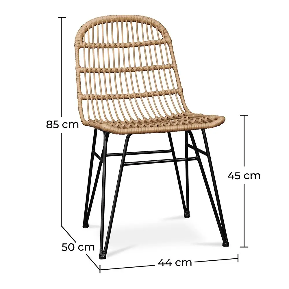 Dank seines Sitzes aus synthetischem Rattan wird dieser Esszimmerstuhl Exotik in Ihr Zuhause bringen. Ein Stuhl aus synthetischem Rattan mit schwarzen Metallbeinen, der dem aktuellen Geschmack angepasst wurde. Die leicht geneigten Beine erinnern an das Vintage-Design. Verleihen Sie diesem herrlichen Stuhl mit einem farbigen Kissen eine fröhliche und exotische Note.