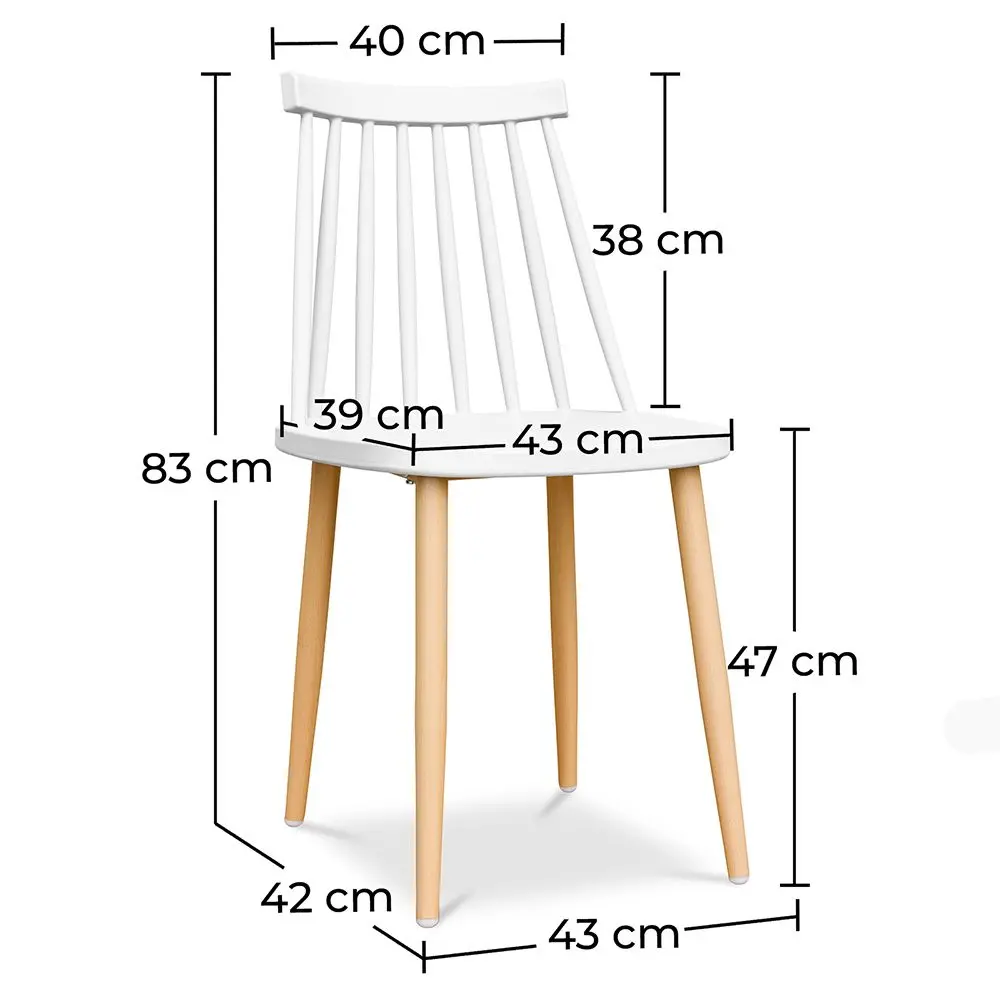 Dieser vom nordischen Stil inspirierte Esszimmerstuhl wird Ihren Speisesaal mit großer Einfachheit ergänzen. Ein Kunststoffstuhl mit einer Rückenlehne aus Stangen und Metallbeinen, die Holz nachahmen.