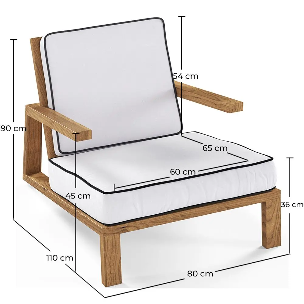 Dieser Outdoor-Sessel aus Teakholz ist eine hervorragende Ergänzung für jeden Außenbereich. Teak, bekannt für seine Langlebigkeit und Wetterbeständigkeit, garantiert eine lange Lebensdauer und ein makelloses Erscheinungsbild. Die abnehmbaren Kissen, bezogen mit Polyester, bieten höchsten Komfort und sind leicht waschbar, bleiben immer frisch und sauber. Perfekt für Gärten, Terrassen oder Balkone verbindet dieser Sessel die natürliche Schönheit des Holzes mit dem Komfort seiner Kissen und bietet eine luxuriöse und praktische Sitzmöglichkeit, um das Draußen zu genießen.