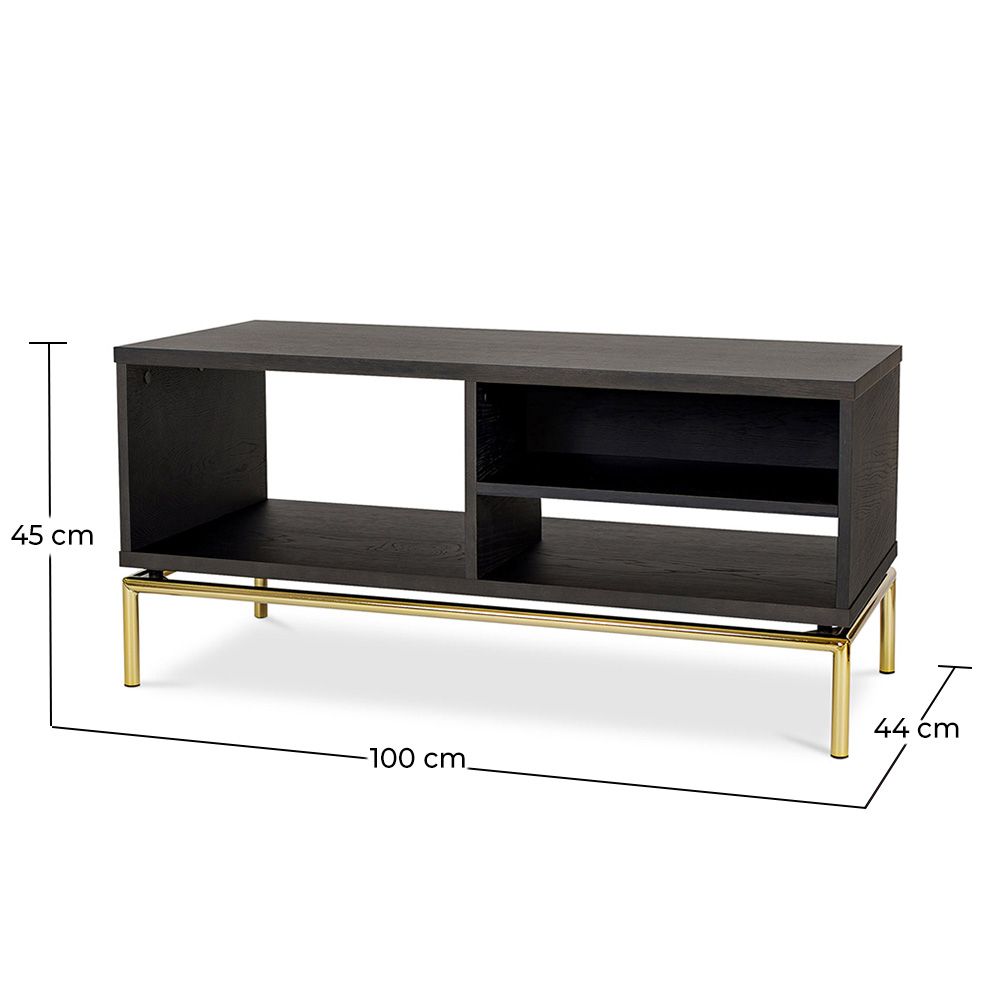 Dieser TV-Schrank besteht aus Holz und glänzenden Stahlbeinen. Er verfügt über mehrere Fächer zur Aufbewahrung kleiner Gegenstände oder zur stilvollen Dekoration. Dieser TV-Schrank gehört zur Zone-Möbelkollektion und ist sehr einfach zu montieren.