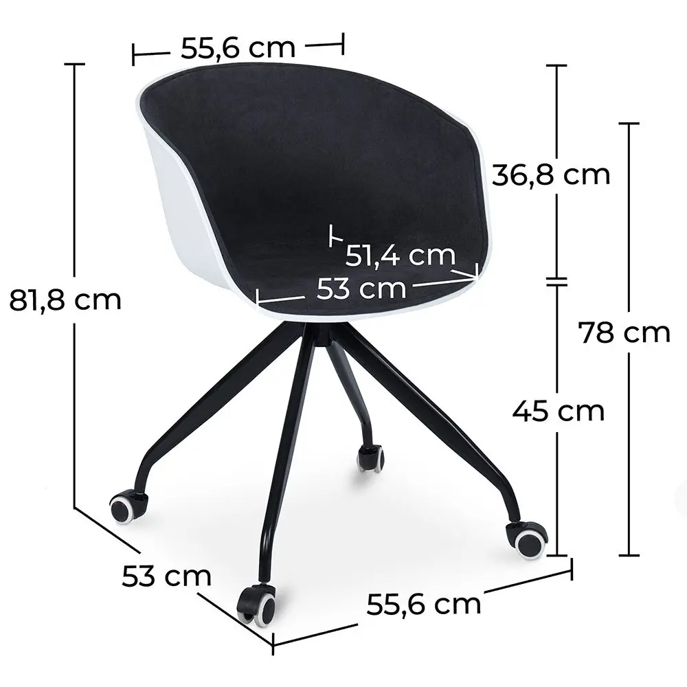 Machen Sie Ihre Bürozeit einfach und bequem mit unserem beliebten Designstuhl. Dank der Räder des Stuhls können Sie problemlos in Ihrem Büro herummanövrieren, um nach etwas zu greifen. Die Beine sind pulverbeschichtet, was ein lang anhaltendes, langlebiges und wirtschaftliches Finish ermöglicht. So ist Ihnen garantiert, dass dieser Artikel Ihnen länger dient als jeder andere gewöhnliche Stuhl. Der Sitz verfügt außerdem über eine weiße PP-Rückenlehne mit einem Stoffkissen, um Ihren Komfort zu verbessern. Mit seinen umfangreichen Maßen bietet Ihnen unser erschwinglicher Stuhl ein Höchstmaß an Komfort, Haltbarkeit und Manövrierfähigkeit, damit Sie die beste Zeit im Büro verbringen, die Sie sich wünschen können.
